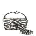 - Oberfläche aus innovativem lasergeschnittenem Leder mit Zebra-Print, Silberner Karabinerhaken am Tragegriff, silberner Reißverschluss, separater größenverstellbarer Tragegurt, silberne Logoapplikation und Nietenapplikationen, zwei Innentaschen, einmal offen, einmal mit Reißverschluss und Logoapplikation, Schutztasche mit Logoschrift. Elegante Handtasche aus italienischer Luxus-Herstellung. Maße: H. 12 cm x B. 27 cm x T. 10 cm.
